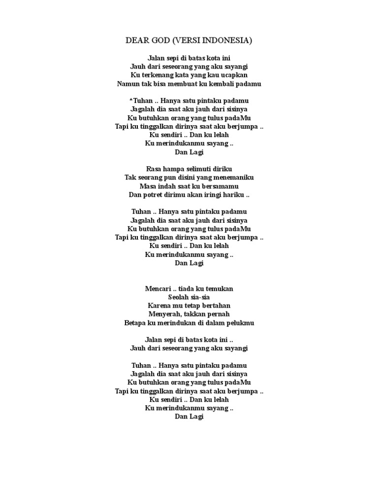 Versi bahasa Indonesia Dear God dikenal dengan judul Tuhan Hanya Satu Pintaku yang populer di tahun 2020. Berikut cuplikannya Lirik Lagu Anugerah Cinta by Erie Suzan feat Beniqno. Berikut cuplikan syair nyanyian teks dari lagunya.